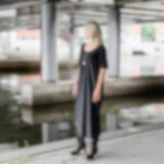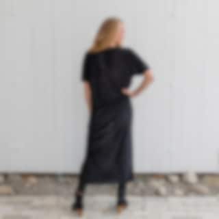 En snygg jerseyklänning i en rak, lång modell med lös passform. Den har kort ärm i dubbelt tyg. Slits på vänstra sidan. Tyget innehåller lurextrådar som ger en glittrig effekt. En älva är broderad nere på vänster sida fram. 80% viskos, 20% lurex. Modellen på första bilden är 173 cm lång och bär storlek XS.