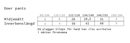 I en del byxor använder vi vävda tyger som Twill. Twill kan ha en slätare eller grövre struktur – alltid i form av diagonala ränder. Vi föredrar att använda vävda tyger med elastan i eftersom det ger mjuka, stretchiga och bekväma plagg. I Doer pants denim blue är tyget lite mörkare och råare blått med viss slitning på framsidan av benet. Tvättas i 40 grader och tvättas med liknande färger. Undvik tvättmedel med blekmedel så behåller färgen sin lyster länge. Kan krympa upp till 5%. Plagg med elastan ska inte torktumlas eftersom elastan är en värmekänslig fiber som skadas av hög värme.