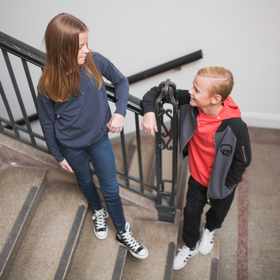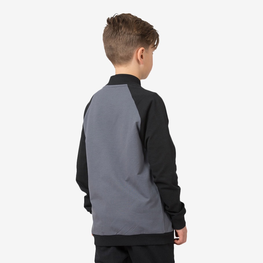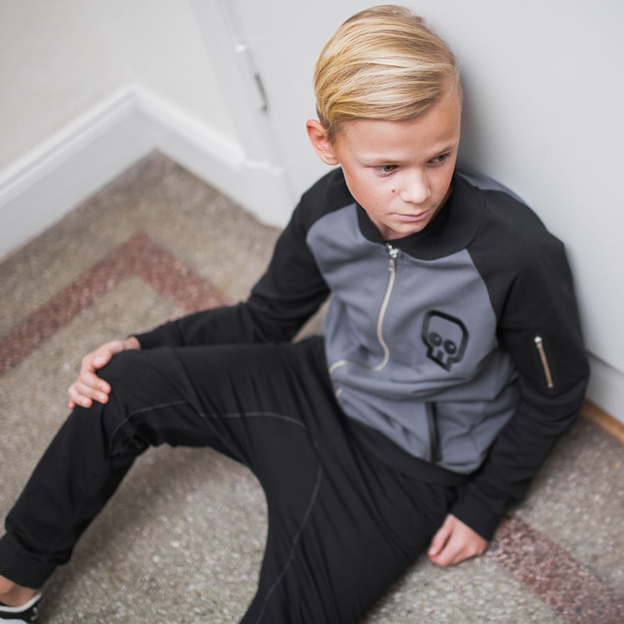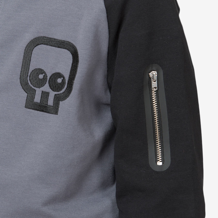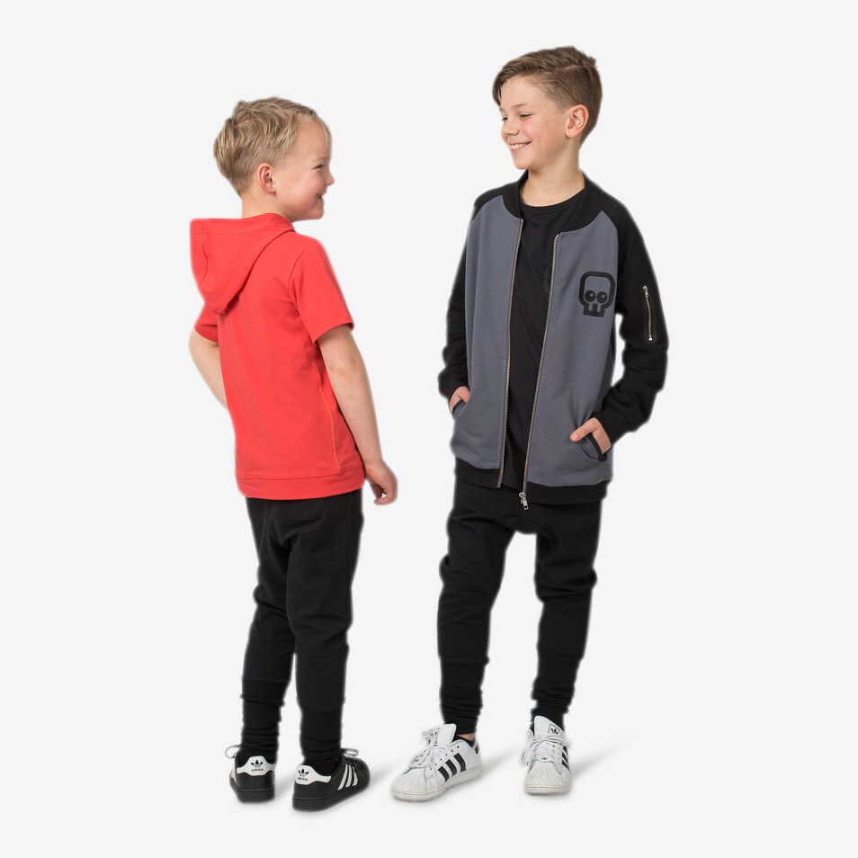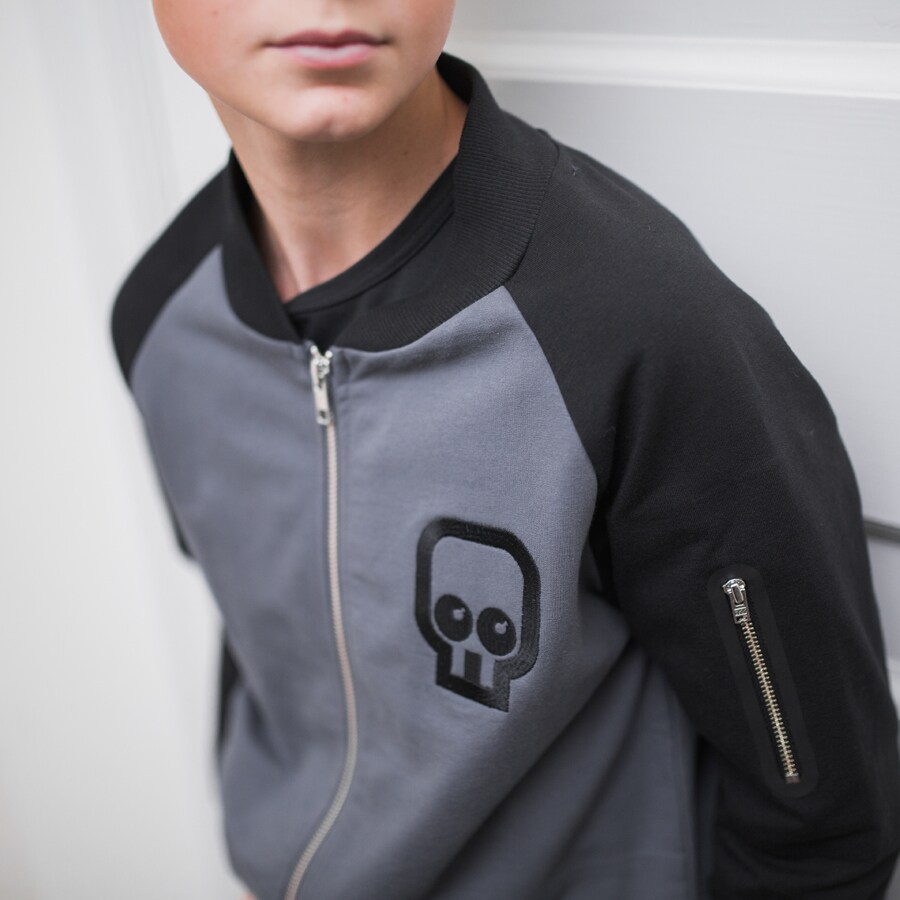 Äntligen en lite längre bomberjacka till våra kids! Grå botten med raglanärmar i svart. Grövre dragkedja i metall i knäppningen samt i den lilla fickan på ärmen. Ficköppningarna är förstärkta som blir till en tuff detalj. Mudd i halsringning, ärmslut och plaggets nederkant. Detta är verkligen en superball jacka till våra tjejer och killar i vår! Vi bär den gärna tillsammans med Brothers tee och Rocker pants black.