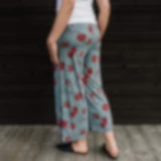Byxor med härlig vidd och 7/8 dels längd. De är gjorda i mjuk modaljersey som har en sammetslen yta. Byxan har en bredare fåll nedtill som ger byxbenet lite tyngd. Enkel resår i midjan med knytband. En älva är broderad på bak under linningen. Modellen på första bilden är 164 cm lång och bär storlek XS.