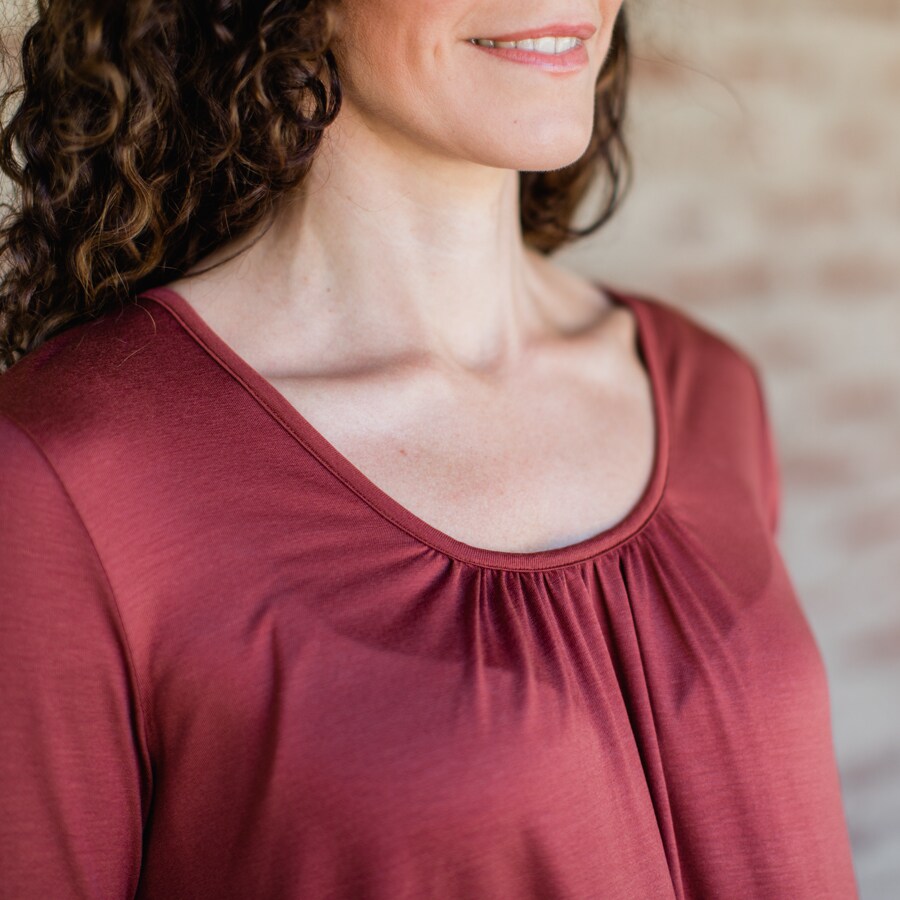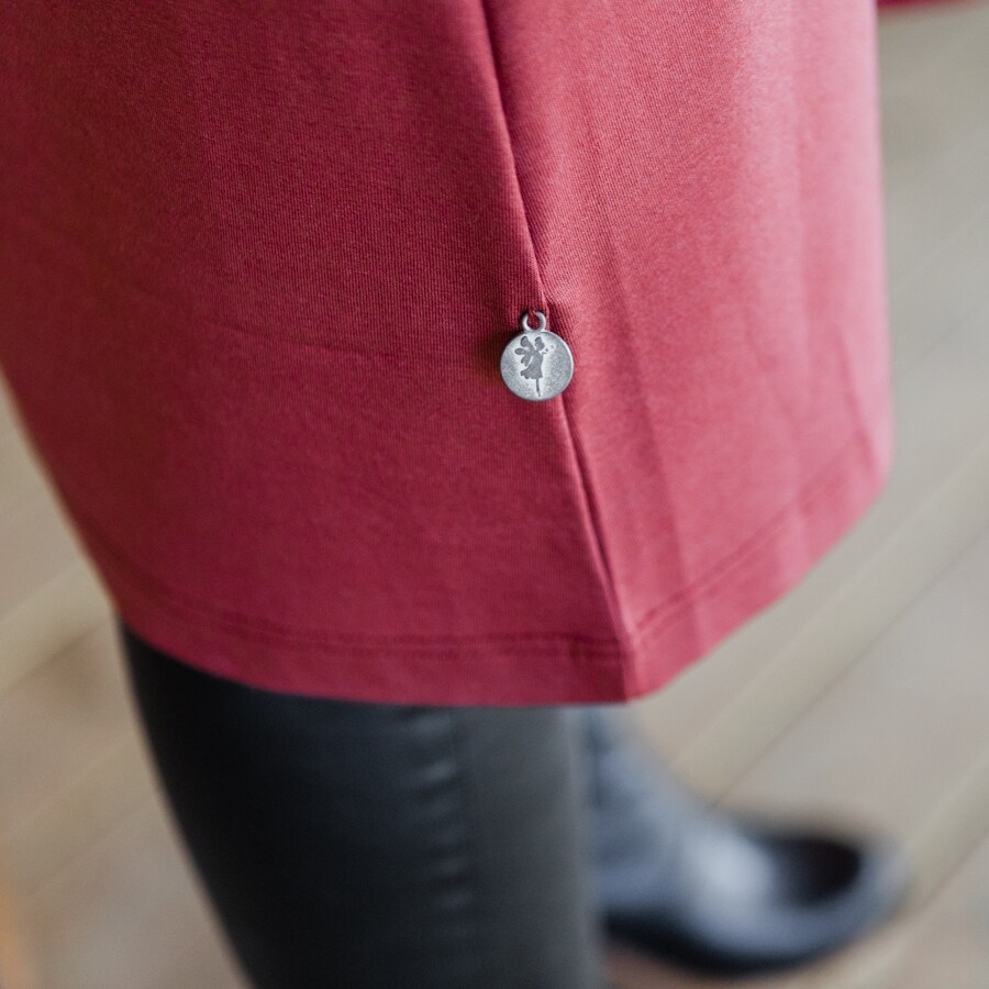 Daily dress är gjord i mjuk jersey. Den är rundhalsad med fint rynk framtill samt bak i nacken. Klänningen är nätt upptill men släpper under bysten till en vid kjol. Den har smala 2/4 långa ärmar. En berlock sitter i ena sidsömmen.