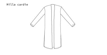 Milla cardie on suoranmallinen pitkä jerseystä valmistettu neuletakki, jossa on näyttävät ja ilmeikkäät halkiot kummassakin sivusaumassa. Kokopitkät kapeat hihat. Takki on valmistettu pehmeästä modaalijerseystä, jossa on samettimainen pehmeys. Keiju-riipus löytyy oikeasta sivusaumasta.