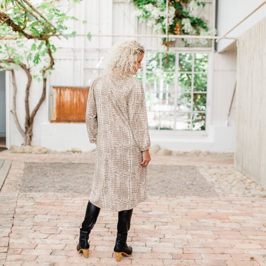 Podium dress är en klänning i mjuk modaljersey med matt sammetslen yta. Den är rundhalsad med ett sprund mitt fram där det sitter en hyska och hake. Raglanärmen är 7/8 lång med en lös mudd nertill. På axeln sitter en fin smockdetalj. Klänningen är rak och lös i modellen och är rundsydd nertill samt lite längre bak än fram. Man kan ha klänningen som den är eller med skärpet. En älva är broderad nere på vänster framsida. Modellen på bilden är 164 cm och bär storlek S.